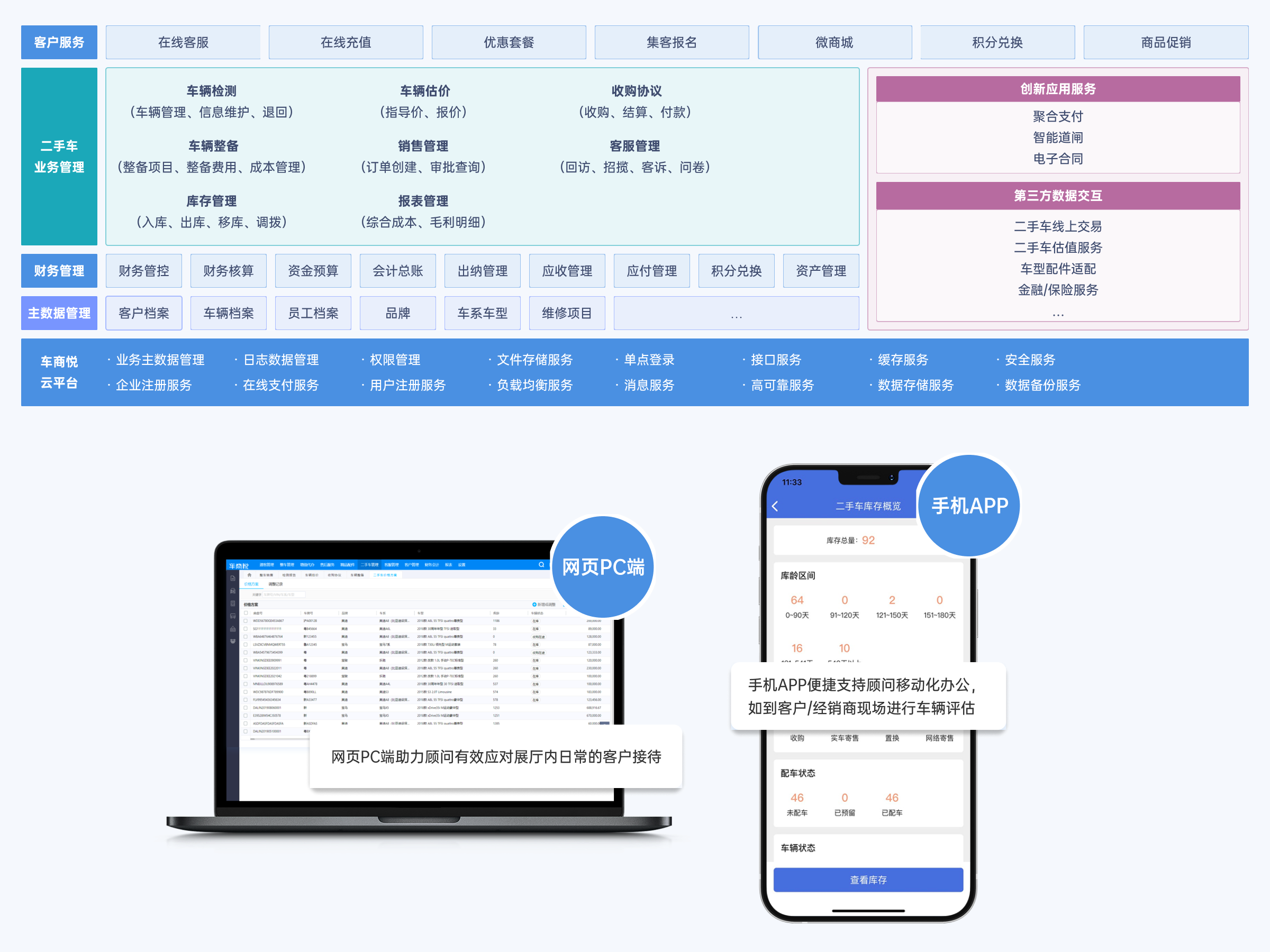 面向二手車商、汽車經(jīng)銷商,構建以核心業(yè)務為基礎的二手車運營服務平臺,實現(xiàn)車輛檢測、評估、收購、整備、庫存、銷售與客戶服務的規(guī)范化、流程化管理,有效提升管理效率與客戶體驗。
